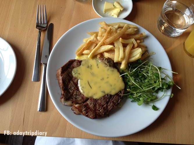เราสั่ง grilled rib eye, chips, béarnaise, watercress สเต็กนุ่มๆ ราดซอสเนย กินจนหมดจนเกลี้ยงเกลา