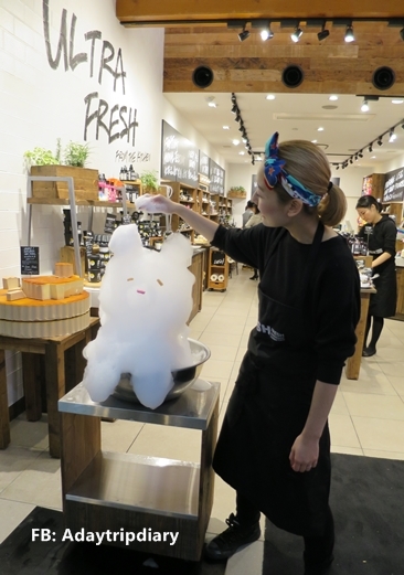 คุณป้าเอา bun ซึ่งเป็นแป้งเหมือนโดนัท ทอดในน้ำมันร้อนจี๋ แล้วเอาขึ้นมาบีบ Hokkaido Soft Serve ใส่
