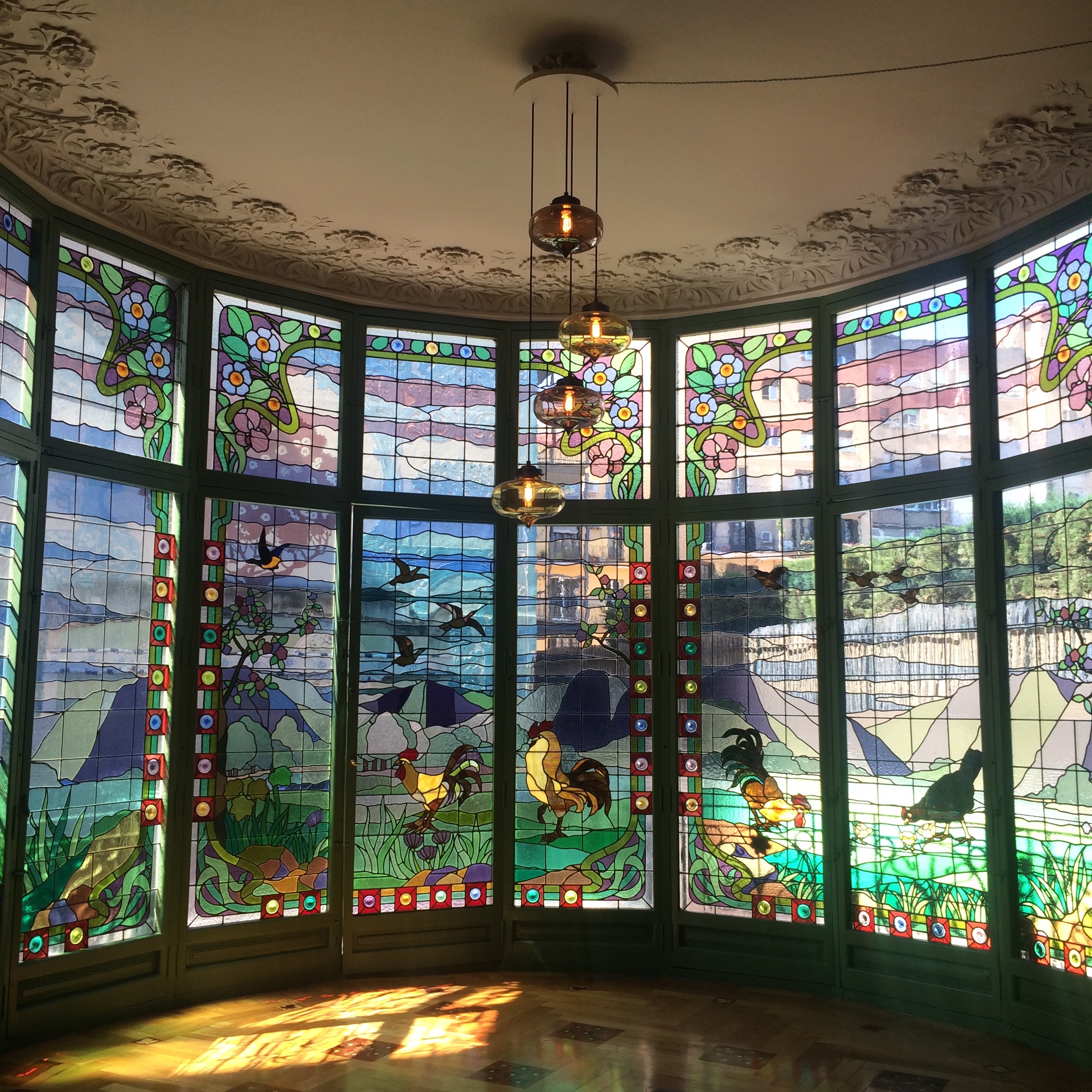 ส่วนอันหลังคือ music hall ที่เปิดให้เข้าชมได้ จุดเด่นในนั้นคือ stained glass ที่แทนที่จะชูยอดขึ้นสูงสู่หลังคา