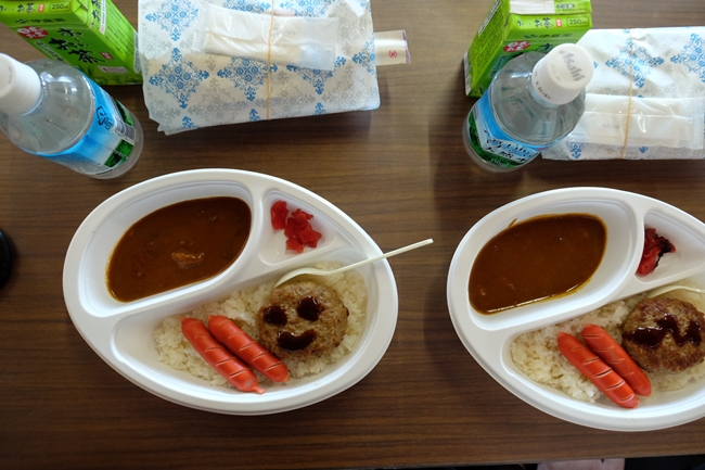 อาหารเย็นคือแกงกะหรี่กับแฮมเบิร์ก และไส้กรอก บูบอก “ทุกฮัททำแกงกะหรี่เหมือนกันหมด คงเพราะมันเก็บง่าย อุ่นได้นาน ไม่มีของเสีย” จะบอกว่ารสชาติดีกว่าที่คิดมาก คือข้าวนุ่มหอม แฮมเบิร์กมีซอสรูป Smiley มาให้ด้วย รสชาติไม่แปลกปลอมอย่างที่คิด ส่วนไส้กรอกนั่น…ปลอมแน่ๆ