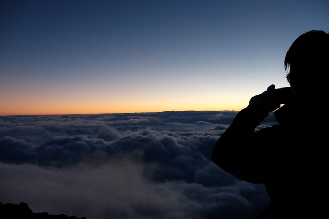 อากาศหนาวกระทบหน้าทันทีที่ออกจากฮัท เมื่อก้มลงมองด้านล่างเห็นแสงไฟจาก headlamp เป็นสายไต่ขึ้นมาตามถนน แปลว่าคนเริ่มขึ้นมาจนถึงนี่แล้ว ขณะเดียวกันพอเงยหน้ามองบนยอด ก็เห็นแสงไฟแบบเดียวกันเรียงตัวเป็นแนวตลบไปมาเป็นเส้นแทยงมุมแบบสุดลูกหูลูกตา…