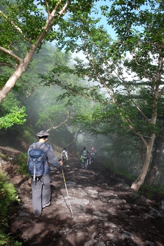 ช่วงนี้เราจะเดินปะปนกับกลุ่มทัวร์ชาวญี่ปุ่น กรุ๊ปทัวร์มักเดินช้ากว่าปกติ เพราะสภาพร่างกายแต่ละคนไม่เท่ากัน แต่เขาให้เดินไปพร้อมกัน และมักหยุดพักพร้อมกันเป็นระยะๆ หัวหน้าทัวร์จะคอยส่งเสียงเชียร์ลูกทัวร์ตลอดการเดินทาง ฟังไม่เข้าใจหรอก แต่น่าจะเป็น “อีกนิดเดียวนะ” “ใกล้แล้วๆ” “อดทนไว้” และ “ใครช้าให้ชิดซ้าย เปิดทางให้คนแซงไป” พอได้ยินเราก็รู้สึกฮึกเหิมตามไปด้วย บางจุดใครช้ามากก็ฉวยโอกาสแซงไปบ้าง แต่สุดท้ายก็กลับไปต่อคิวเค้าอยู่ดีแหละ