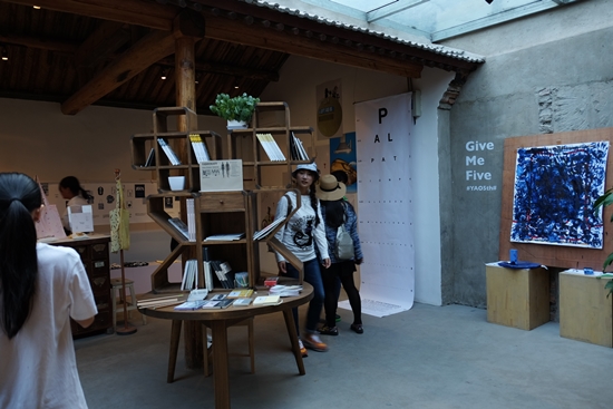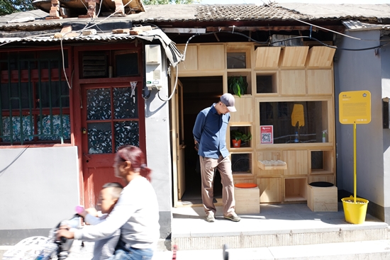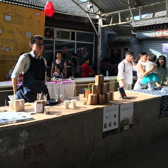 ตอนที่เราไปเป็น Design Week พอดี ซึ่งเป็นการร่วมมือกันระหว่างชาวบ้านในละแวกนี้ + คาเฟ่/ร้านค้า + ศิลปิน คนทำงานคราฟท์ และ Beijing Design Week มาจัดนิทรรศการเล็กๆ จำนวนมาก เรียกว่า Design Hop ซุกซ่อนอยู่ตามบ้านหลังต่างๆ ในย่านนี้ กินพื้นที่กว้างขวางมาก โดยที่บ้านไหนมีนิทรรรศการ เค้าจะวางป้ายเหลืองๆ ไว้ด้านหน้าให้ได้รู้กัน และสิ่งที่จัดแสดงส่วนใหญ่ก็มีเนื้อหาเกี่ยวกับงานมือพื้นถิ่น (เช่นการแกะช้อนไม้ ทำบล็อกปริ๊น วาดรูปฯลฯ) และความรู้เกี่ยวกับบ้านฮูตงในรูปแบบงานอาร์ตต่างๆ เช่นภาพถ่าย ชิ้นงานใหญ่ๆอย่างโครงสร้างเหล็ก จำลองแบบบ้านสมัยก่อนในบ้านจริงๆ และเค้าชวนให้เราเดินไปตามตรอกเล็กๆ เพื่อเข้าบ้านด้านในๆ ด้วยการตกแต่งด้วยต้นไม้ซะสวยเชียว โอ๊ยยย…อยากบอกว่าสนุก เดินเพลินมาก! ทำให้ลึกซึ้งกับชีวิตความเป็นอยู่ของคนที่อาศัยในฮูตงขึ้นอีกอักโขบอกเลย