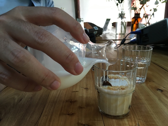 อย่างที่เกริ่นว่า เราเป็นคนแพ้ทางห้องน้ำเน่า วันๆ เลยพยายามกินน้ำแต่น้อยเพื่อให้เข้าห้องน้ำน้อยสุด แต่ร้านนี้มองๆ ผ่านแผ่นพลาสติกด้านหน้าแล้ว อยากเข้าไปกินอะไรสักอย่างบอกไม่ถูก เพรารู้สึกถูกจริต ปรากฎว่าด้านในให้ความรู้สึกดีมาก ไม่พอเจ้าของน่ารักเป็นกันเองมาก ไม่พอ…ห้องน้ำก็มีให้ใช้ และสะอาดมากกกกกกก!!!!!!! ดังนั้นไปอุดหนุนเค้ากันนะ คุณบูสั่งกาแฟเย็น เค้าก็ให้ espresso น้ำแข็งกับนมเย็นมาเทเอง สนุกมาก ส่วนเราสั่งอิตาเลียนโซดามาดื่มชุ่มคอ