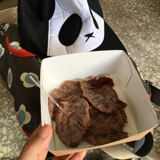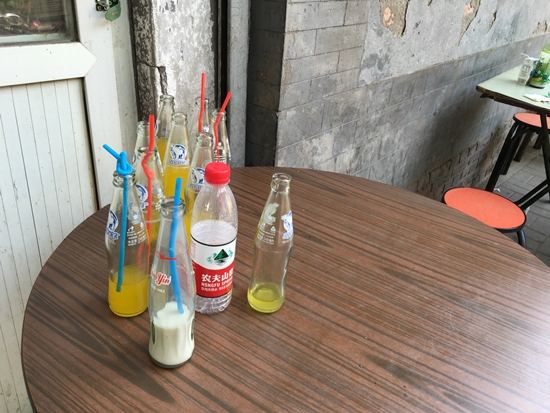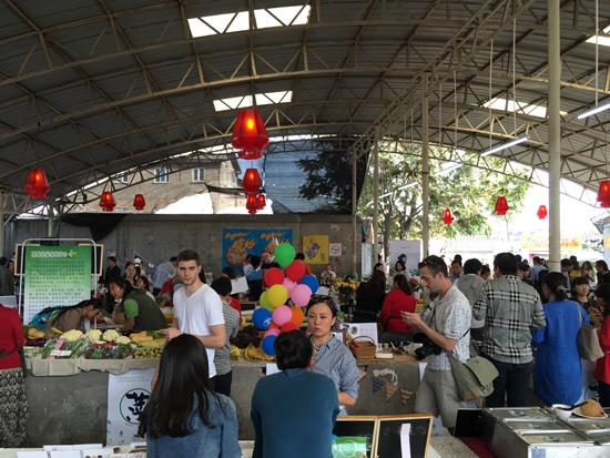 ตอนแรกตั้งใจกินอาหารเสฉวนเล็กๆ ที่เดินผ่าน เพราะเห็นว่าเป็นร้านที่ Time Out แนะนำ แต่…ไปถึงตอนร้านปิดพอดี เลยเดินโต๋เต๋ผ่านตรงนี้ ซึ่งตอนแรกคุณบูนึกว่าเป็นโรงเจ 5555555 ปรากฎกลายเป็นตลาดออร์แกนิกแสนเริดของชาวปักกิ่งเขาค่ะ! ตลาดจัดอยู่ในละแวก Dashilar นั่นแหละ ห่างจากร้านเสฉวนไม่ถึง 50 ก้าวได้มั้ง มีผักออร์แกนิก น้ำผลไม้คั้นสด เบียร์แพนด้า อาหารปรุงสุกจำนวนหนึ่ง ขนมประเภทต่างๆ ตลาดไม่ใหญ่มากแต่ก็รู้สึกได้บรรยากาศที่สนุกดี เพราะมีดนตรีสดเล่นด้วย เราเลยฝากท้องกับเตี๋ยวยูนนานและเนื้ออบ กินกับน้ำผลไม้และเบียร์แพนด้า