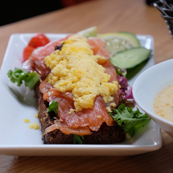 แซลมอนสแครมเบิลบนขนมปังไรย์ของบู